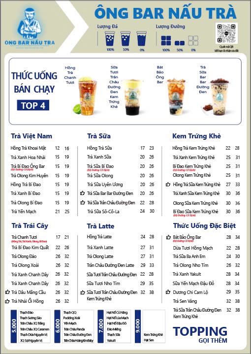 Chào mừng quý khách đến với Ong Bầu Trà! Chúng tôi rất vui mừng giới thiệu menu mới với nhiều món trà, kem và topping hấp dẫn, chắc chắn sẽ làm hài lòng mọi thực khách.